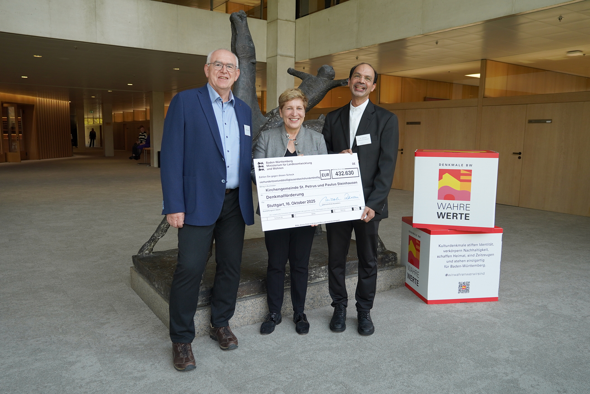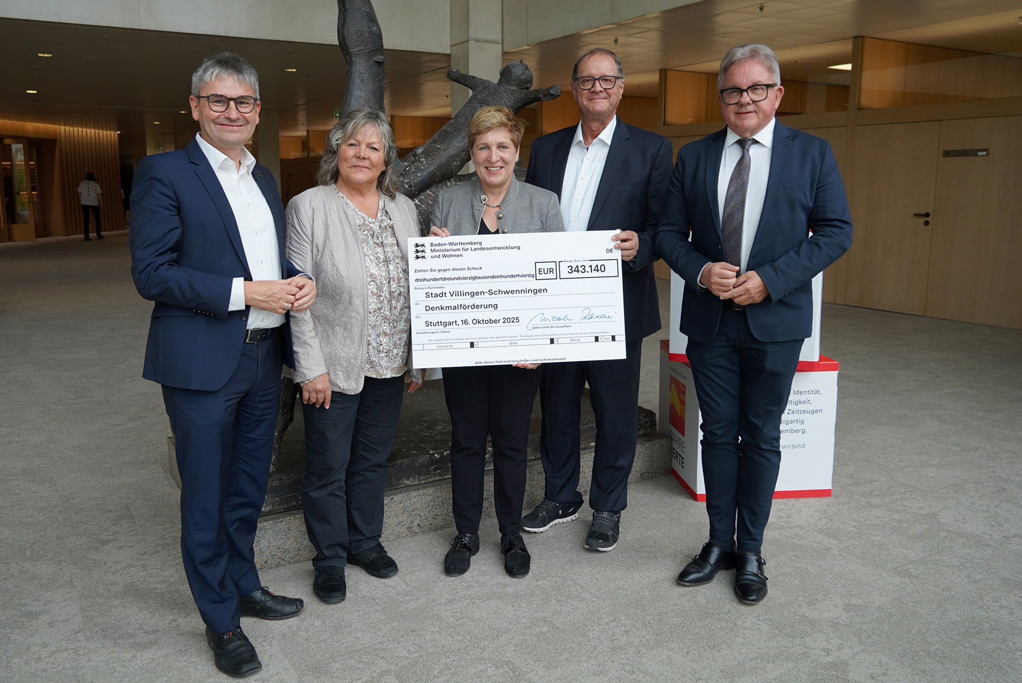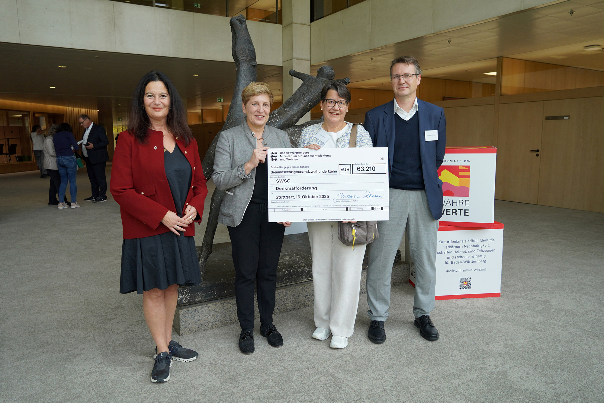 Die Ministerin für Landesentwicklung und Wohnen, Nicole Razavi MdL, überreichte am 16. Oktober 2025 im Stuttgarter Landtag symbolische Schecks an fünf Denkmaleigentümerinnen und -eigentümer aus Baden-Württemberg.