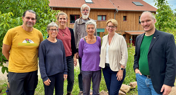 Den Auftakt bildete ein Besuch der Wohn- und Lebensgemeinschaft in Sexau am Montag, 4. August 2025: Das Stroh-Lehm-Bauprojekt mit acht Wohneinheiten und Gemeinschaftsräumen wurde von einer Baugruppe aus mehreren Familien auf einem knapp acht Hektar großen Gelände bei Freiburg gemeinschaftlich umgesetzt. Rund 100 Tonnen Lehm wurden auf vielfältige Weise verbaut, zum Beispiel in Form von Lehmsteinen in den Zwischendecken und Innenwänden oder zum Verputzen der Wände. Zudem wurde extra ein Verfahren entwickelt, um in der Zimmerei die Holzständerwände vorzufertigen und mit Strohballen von der Schwäbischen Alb auszufachen. So konnten die Häuser jeweils binnen eines Tages aufgestellt werden. Der mitwirkende Zimmereibetrieb hat diese Bauweise nach dem erfolgreichen Pilotprojekt in der Region etabliert. Die Projektverantwortlichen wurden im letzten Jahr mit dem Innovationspreis Lehmbau BW ausgezeichnet.