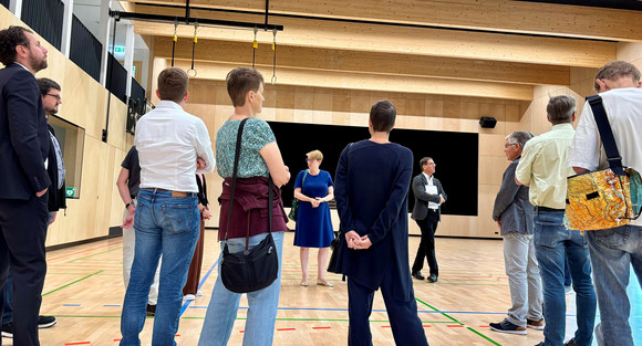 Am Mittwoch, 6. August 2025, besichtigte Staatssekretärin Andrea Lindlohr zunächst den Neubau einer Mehrzweckhalle in Stutensee-Staffort. Die neue Drais-Halle enthält neben einer Sporthalle eine Bühne und einen Gymnastikraum. Sie ist für den Schul- und Vereinssport nutzbar und verfügt über entsprechende Nebenräume mit Vorbereitungsküche, Speise- und Aufenthaltsräumen. Das Gebäude nimmt durch seine einfache kubische Form eine klare architektonische Haltung ein. Das Tragwerk des Gebäudes besteht aus Stahlbeton, Holz und Holzwerkstoffen. Auf dem Dach ist eine Photovoltaikanlage installiert. Die N!BBW-Nachhaltigkeitskriterien wurden bei Ausschreibung, Planung und Bau vorbildlich berücksichtigt.