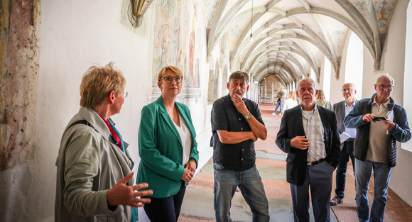 Anschließend besichtigte die Staatssekretärin eine der eindrucksvollsten Klosteranlagen Baden-Württembergs. Jahrzehntelang dem Verfall preisgegeben, wurde das ehemalige Zisterzienserkloster ab 1973 durch das Engagement der Stefanus-Gemeinschaft und des Architekten Johannes Manderscheid sensibel restauriert und als Bildungsstätte neu belebt. Die behutsame Verbindung von denkmalpflegerischer Verantwortung und zeitgemäßer Nutzung macht die Anlage bis heute zu einem wegweisenden Beispiel im Umgang mit historischem Erbe – ganz im Sinne des Europäischen Denkmalschutzjahres 1975 und des diesjährigen Mottos „WERT-voll: unbezahlbar oder unersetzlich?“.